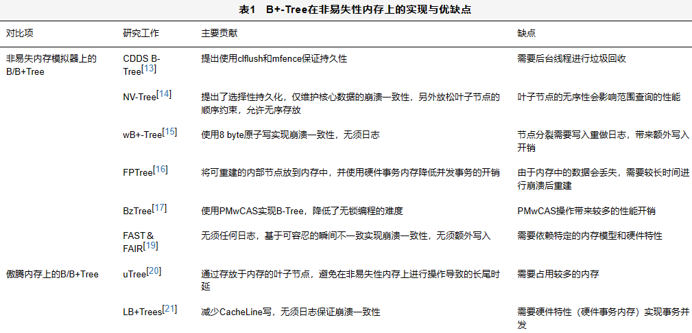 非易失性内存是一种新兴的存储介质,其具备字节可寻址、内存级别读写时延的特性,这给当前大量的存储系统带来了根本性的变革。非易失性内存正在迅速发展,现有的大部分非易失性内存(如相变内存、STT-RAM等)仍处于研究阶段,但由美光科技有限公司和英特尔联合研制的傲腾持久内存(基于3D XPoint)已经发布,并且投入市场。由此,在存储系统中尽可 能发挥非易失性内存性能优势的需求越发迫切。其中,面向非易失内存研发新型持久索引数据结构是解决该问题的关键。在存储系统的设计与实现中,持久索引数据结构是核心之一。文件系统中文件路径到索引节点的寻址、大文件中偏移量到指定数据块的寻址、键值存储系统中根据键寻找值的数据结构、数据库中的聚集索引等,都需要持久存储的索引数据结构,且这些持久索引数据结构的实现对系统本身的性能至关重要。但这些持久索引数据结构目前大多面向传统存储设备进行优化,而不能高效利用非易失性内存的硬件特性。将这些持久索引数据结构在非易失性内存上重新设计实现,并面向非易失性内存的硬件特性进行优化,能够大大降低存储系统的时延、提升吞吐量。近年来,已经有一些工作对非易失性内存上的存储系统进行了深入的探讨和研究。陈游旻等人在大数据环境下分析了基于新型存储硬件进行存储系统构建的挑战和趋势;Liu H K等人对非易失性内存下的内存架构设计、持久内存管理、性能优化和功耗管理、编程框架以及非易失性内存之上的应用进行了全面的综述;Lersch L等人将基于模拟非易失性内存设计的有序索引数据结构进行分析,并在英特尔傲腾持久内存上进行了测试;Hu D K等人则针对面向非易失性内存构建的哈希表进行了测试和分析。另外,邓镇龙等人将非易失内存与MPIIO相结合,大大提升了应用在高性能集群上的读写性能;杨青霖等人提出的高效数据缓存方法显著提升了存储系统的读写性能。这些工作对在非易失性内存上设计存储系统具有重要的指导意义。本文从持久索引数据结构的设计出发,对不同的设计之间的差异进行细粒度的对比。提高持久索引数据结构的性能是实现低时延、高吞吐的现代存储系统亟须解决的问题。针对大量在非易失性内存上优化持久索引数据结构的工作,笔者对其进行分类、汇总、对比,厘清索引数据结构的发展主线,总结其中的关键挑战,并对其发展趋势进行展望。2 持久索引数据结构