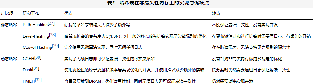 随着NoSQL存储系统逐渐发展,无须维护数据有序性从而具备更小开销和更简洁实现的哈希表目前在各种存储系统中得到越来越广泛的应用,如MongoDB、HBase、Memcached等。在哈希表的设计中,需要解决的两个核心问题分别是哈希表扩容和哈希冲突。哈希表扩容指的是当哈希表的容量不足以容纳用户需要写入的所有数据时,哈希表需要进行容量扩大,并根据需要将旧的数据重哈希到新的哈希表上。哈希冲突指的是哈希表中的单个桶(bucket)没有空闲位置放置键值对的情况。现有的针对哈希表的研究可分为两类:动态哈希和静态哈希。在静态哈希中,当哈希表容量需要进行扩大时,一般需要创建一个更大的哈希表,并将旧哈希表中的数据重新插入新的哈希表中,其扩容的开销与哈希表本身包含的数据量成正比。关于这种哈希表在非易失性内存上的实现,目前的研究成果如下。Zuo P F等人提出的Path-Hashing针对非易失性内存环境下的哈希表,指出以往的哈希表设计会带来大量的额外写,这会极大地影响哈希表在非易失性内存上的性能。因此他们提出了一个基于路径的哈希表。该哈希表通过位置共享技术解决哈希冲突问题,优化了对CPU缓存的使用且不会带来额外的写。为了进一步提高负载因子和读写性能,Path-Hashing还能够使用两个哈希函数构建两条搜索路径,并进行路径压缩,在缓解哈希冲突的同时,减小路径的深度。Zuo P F等人进一步优化了哈希表的写入操作,提出了Level-Hashing。他们不仅提出了一种写优化的层次哈希结构,通过双哈希函数和冲突后一次键值对的移动来提升哈希表的负载因子,同时还实现了一种原地扩容机制,这让LevelHashing只需要对1/3的内容进行重哈希,将处于底层的内容重新写到顶层的哈希表中,即可完成扩容。另外Level-Hashing还能够以无须日志的方式保证插入、修改、删除、扩容操作的一致性,只有更新操作可能需要写日志。Chen Z Y等人提出的CLevelHashing对哈希表的并发性能进行了大量改进。一方面,CLevel-Hashing能够在后台异步扩容和重哈希,而不会阻塞操作,从而避免了等待扩容导致的长尾时延;另一方面,过去哈希表一般使用锁来实现并发,他们针对读取、插入、更新、删除操作均基于CAS原语实现了无锁并发算法,从而避免锁竞争,提升哈希表的扩展性。相对于静态哈希,动态哈希能够根据用户插入的键值对的数量灵活地扩大或缩小哈希表的容量,每次扩容时只需要常数时间复杂度的开销。Nam M等人在非易失性内存中引入了可扩展哈希CCEH(CacheLineconscious extendible hashing)。基于原始的可扩展哈希设计,他们根据非易失性内存的特性进行了一些改进,包括将桶的大小设置为缓存行的整数倍,以及增加一层段(segment)来减少空间占用。同时他们还提出了一种崩溃恢复算法,使其能够保证在修改CCEH和进行段分裂时无须任何日志即可保证崩溃一致性。Lu B T等人进一步提出了一种扩展性更好的哈希表Dash。他们认为不仅要优化非易失性内存上的写入,还要尽量减少非易失性内存上的读取操作。因此他们对Dash做了两方面的优化。从哈希表本身的设计上,他们提出基于指纹对键的存在与否进行快速的判断以优化读取速度,同时在哈希冲突的解决上,他们使用哈希桶间自平衡的方法来提高哈希表的负载因子。同时Dash还能够让插入和更新操作均不需要用日志来保证崩溃一致性,仅在段分裂时需要使用重做日志。另外,Dash还使用了优化的并发控制访问,读取不需要锁的参与,写时使用原子变量实现互斥访问。Zou X M等人提出了HMEH(hybrid memory extendible hashing)。他们在CCEH的基础上,考虑到可扩展哈希的目录层可通过非易失性内存上额外构建的一颗基数树来重建,因此将目录层放到DRAM中,以减少非易失性内存上的读写。另外他们还提出了一种利用8 byte原子写实现的键值交错策略,使HMEH无须任何日志也无须显式地刷写缓存行就能够保证一般操作的崩溃一致性。对于段分裂操作,基于之前设置的基数树,HMEH实现了一种无须任何日志和写时复制的分裂方法。哈希表在非易失性内存上的实现与优缺点见表2,可以发现,其发展趋势与有序索引数据结构是一致的,在充分利用硬件特性进行优化的同时,无须日志的崩溃一致性保证和无锁算法成为在非易失性内存上高效实现索引数据结构的关键所在。