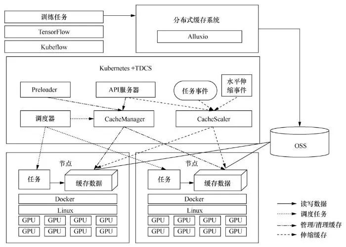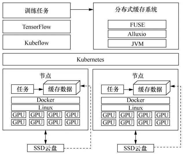 为了规避计算和存储分离架构带来的数据访问时延,典型做法是在开始模型训练之前,将训练数据复制到GPU计算节点本地的磁盘存储中,如普通机械硬盘或者NVMe SSD等高速存储设备;或者将数据提前复制到部署在计算节点上的分布式存储系统中,如Ceph、GlusterFS。随后计算任务就相当于从本地读取训练数据,有效缓解了数据访问时延对GPU计算性能的影响。然而,这种额外的数据迁移过程会面临如下问题。● 把训练数据复制到GPU节点的方式低效且难以管理。如果是手动复制,非常容易出错。● 深度学习训练数量很大,且可能持续增加。“云上”GPU计算节点配置的磁盘容量有限,经常出现无法存放全量训练数据的情况。● 将训练数据存放在多个GPU计算节点上的分布式存储系统内,可以解决数据容量问题,但分布式存储系统自身的运维成本和难度都很大;并且,存储系统与计算节点耦合,本身也会产生计算、网络、I/O等本地资源的争抢和干扰问题。3 基于分布式缓存的容器化深度学习模型训练系统