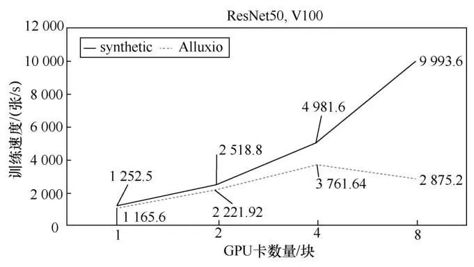 对实验中模型精确度达到业界标准情况下的训练速度结果进行评估。分别使用合成数据(即synthetic)和Alluxio缓存系统访问存储服务中的真实数据(即Alluxio)进行模型训练,并对比性能结果,如图2所示。横轴表示任务使用GPU卡数量,纵轴表示训练速度。合成数据是训练程序在内存中生成的数据,节省了I/O开销,可作为训练性能的理论上限。图2 使用合成数据和Alluxio缓存系统访问存储服务中的真实数据训练的速度对比由图2可以看出,使用1~2块GPU卡训练时,两者性能差距在可以接受的范围内;但当GPU卡增加到4块时,二者性能差距比较明显;当GPU卡数量达到8块时,使用Alluxio缓存系统访问存储服务中的数据的训练速度下降至使用合成数据的28.77%。通过监控观测到GPU服务器的系统资源利用率并不高,这说明使用Alluxio默认配置实现的分布式缓存系统无法支持GPU训练规模化扩展。这成为深度学习训练平台能力的瓶颈。通过分析Alluxio的系统架构和实现方法,发现造成无法支撑训练任务性能弹性扩展的主要原因有如下3个。● Alluxio的文件操作需要进行多次远程过程调用(remote procedure call, RPC)才能获取到数据。● 默认情况下,Alluxio优先将全量数据缓存在本地节点。当本地缓存容量饱和时,就会驱逐已缓存数据。如果被驱逐数据很快又被任务读回,就会导致同一份数据频繁写入和删除,形成数据震荡。● 缓存系统提供的用户空间文件系统(filesystem in userspace,FUSE)接口虽然易于使用,但是读写性能并不理想。在深度学习训练任务多线程高并发读写下,需要优化FUSE的配置参数。4.3 优化Alluxio系统参数