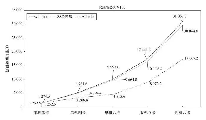 优化上述系统参数后,在一台配置8块GPU卡的服务器上再次训练ResNet50模型。如图3所示,训练速度明显加快,与使用合成数据的训练速度仅相差3.3%左右。并且,这样的加速效果可以接近线性地扩展到4台服务器(共32块GPU卡)的实验中。然而,实验中发现,继续增加GPU资源后,缓存加速的扩展性瓶颈再次出现。这使得优化Alluxio系统参数的方法只能对使用少于32块GPU卡的ResNet50训练任务产生良好的加速效果。同时,本文前述实验都使用阿里云SSD云盘作为数据存储。虽然SSD云盘可以提供300 MB/s以上的I/O吞吐性能,但是单块云盘容量有限,且成本较高。如果在更大量级的训练数据集上执行更大规模的分布式训练任务, SSD云盘并不是最佳选择。实际上,在大规模分布式训练场景中,使用具有较高性价比的阿里云对象存储服务(object store service,OSS)是更常用的方案。本文后续实验也将采用OSS作为训练数据集的存储方案。