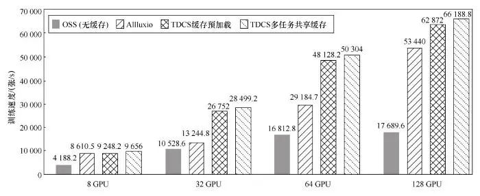 为了在前文实验基础之上,验证TDCS进一步提升训练任务性能的效果,本文使用相同的ResNet50图像分类模型和ImageNet图像识别数据集,在不同数量的GPU资源上测试了多组分布式训练任务。如图5所示,4组实验数据分别使用8、32、64、128块NVIDIA Tesla V100 GPU卡进行分布式训练。每组实验都对比了使用4种不同缓存配置的训练速度。图5 使用TDCS协同调度分布式缓存加速ResNet50模型训练的实验结果对比配置2:使用默认配置Alluxio读取OSS数据。配置3:在配置2的基础上增加TDCS训练数据预加载策略。配置4:在配置3的基础上增加TDCS多任务缓存数据共享策略。其中,使用配置3、4的实验中,都使用了TDCS分布式缓存弹性策略。总体来看,使用TDCS协同调度增强的分布式缓存之后,实验任务的训练速度能达到直接读取OSS数据的任务速度的2.2~3.7倍。在所有实验中,使用默认配置的Alluxio读取训练数据后,都会比不使用缓存的训练速度有大幅提升,加速比范围为25%~200%。在增加使用TDCS训练数据预加载策略后,相比仅使用默认Alluxio的加速比会提升7%~102%。在继续增加使用TDCS多任务共享缓存调度策略后,训练速度依然还有4%~7%的提升。特别地,当使用默认配置的Alluxio加速8 块 GPU卡上的训练 任务时,由于计 算资源 不足,已 经出现 瓶 颈,继续增加使用TDCS的协同调度策略并不能进一步明显地提升训练性能。7 结束语
