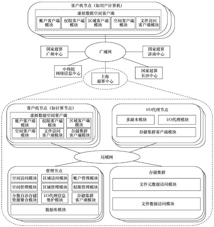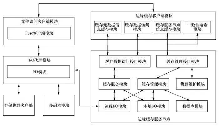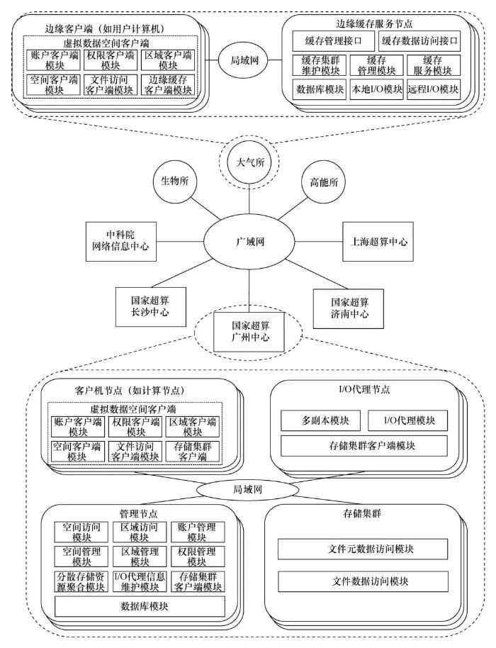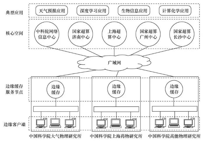 边缘缓存的起源可以追溯到20世纪90年代,Akamai公司提出了内容分发网络(content delivery network)的概念。内容分发网络是一种基于Internet的缓存网络,其依靠地域分散的内容缓存服务器,将需要分发的文件在广域网上放置多个副本,并通过中心平台的调度和负载均衡策略,将用户的访问发送到距离较近的内容服务器上,从而缓解网络拥塞,提高广域网数据访问的速度。2006年亚马逊提出了弹性计算云(elastic compute cloud)的概念,在计算、存储和可视化等方面开启了许多新的机遇。Ramaswamy L等人提出了合作式边缘缓存网格,该网格由多个分布式的边缘缓存云组成,如果缓存未命中,边缘缓存节点能够从临近的边缘缓存云中获取文件数据,以缩短用户等待时间。2009年,卡内基梅隆大学的Satyanarayanan M等人引入了微云(Cloudlet)作为边缘计算的形式, Cloudlet部署在网络边缘,并与互联网连接,是一个可信且资源丰富的主机,可以被移动设备访问及为其提供服务。2014年,Storj Labs提出了一种去中心化的云存储平台STORJ,该平台使用P2P网络连接存储设备,并借助以太坊区块链技术激励用户将闲置的存储资源充分利用起来,从而以非常低廉的维护和管理成本为边缘端提供存储服务。2017年,Chen B Q等人提出了一种基于D2D(device to device)网络的边缘缓存模型,其按照集群的方式划分边缘用户,将热文件缓存在各个集群中,从而可将D2D缓存网络的吞吐量提高4倍。2019年,Tan H S等人研究了多个边缘服务器的在线协作缓存机制,当本地边缘服务器没有所需数据/服务时,可以选择与周边的边缘服务器关联合作(代价小),或者将服务请求直接发送到云端数据中心(代价大),或者下载云端数据/服务安装到本地,并在必要时替换本地已有内容(代价大),其分别设计了具有确定性和随机性的在线协作机制,优化了服务所需代价,给出了性能的理论保证(具有渐进最优的竞争比),通过真实/基准数据集模拟,验证了该机制的有效性。● 现有边缘缓存研究都是针对互联网环境中的数据共享应用的,没有考虑国家网格中高性能计算应用负载的需求,如跨多个超算中心的存算协同等要求,从而无法满足国家各超算中心跨广域的数据共享需求。因此,不能有效地满足广域虚拟数据空间系统的性能需求。● 现在国内外没有开源的边缘缓存系统,现有的系统多为商业系统且闭源。通过研究自主可控的边缘缓存系统并将其开源,将弥补国家网格中高性能计算环境的空白,并进一步提升广域虚拟数据空间系统的性能,有效地提高大型高性能计算应用的性能。3 边缘缓存架构和关键技术