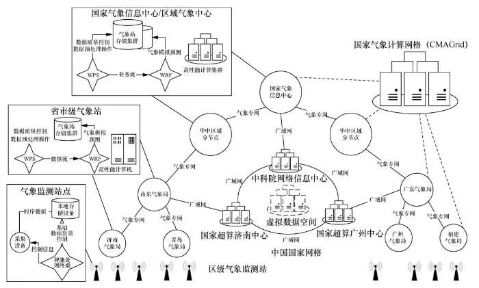接下来,通过一个实例阐述当前广域虚拟数据空间系统在广域环境中的冗余数据传输问题。在气象预测场景中,气象数据大多来自网络边缘的采集设备,经过多种处理工序,最终上传到超算中心进行分析,整个过程中会将产生的数据进行多次共享和复制。尽管广域虚拟数据空间系统可形成统一的存储视图,方便了数据管理和数据访问,但当同一区域的多个边缘客户端共享和访问数据时,广域网下仍存在大量的冗余数据复制。以图2所示的天气预测过程为例,气象数据来源于全国各地的气象监测点,数据主要包括气温、气压、降水、风向、风速、湿度和辐射等,数据通过气象监测站点的边缘设备进行同化处理后,汇总至省市级气象站,之后进一步汇总至区域级和国家级气象信息中心进行气象预测;各级气象预测单位之间通过国家气象计算网格和中国国家网格的网络进行数据传输。广域虚拟数据空间系统对全局气象数据实现了广域网环境的统一管理和调度,然而,在广州气象局和福建气象局同时需要山东气象局的数据时,两者会同时从广域网环境中访问并获取数据,从而造成冗余数据传输。假设在广东气象局设置边缘存储或者边缘缓存,将气象数据进行缓存,广州气象局和福建气象局从广东气象局获取数据将极大地减少冗余数据传输。另一种情况,当青岛气象局需要济南气象局的数据时,如果在山东气象局设置边缘缓存,济南的气象数据不用到达虚拟数据空间核心空间,即可通过边缘缓存将数据传递给青岛气象局,从而提高广域虚拟数据空间系统的数据共享效率。
