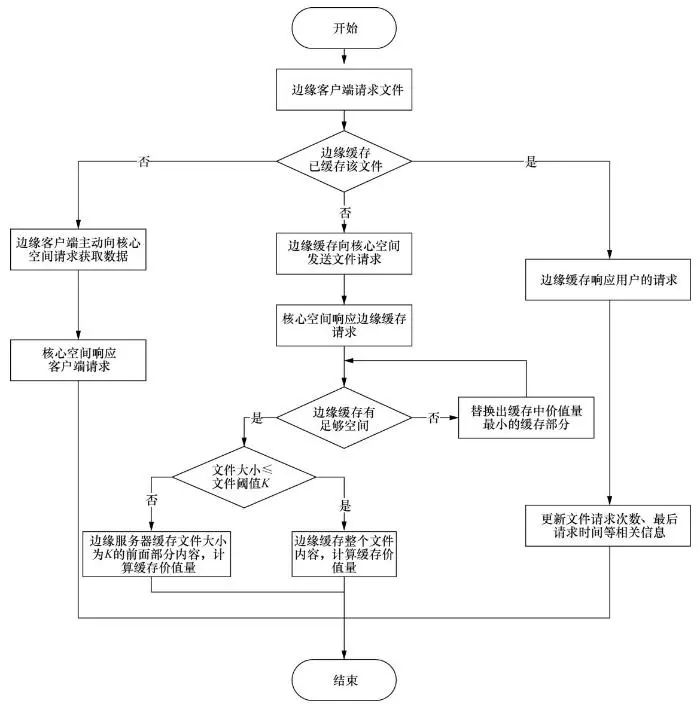 边缘缓存系统将广域虚拟数据空间系统中的数据以文件粒度进行缓存,整个边缘缓存系统以键值形式的扁平化数据结构进行索引。边缘缓存系统的工作流程如图4所示。边缘客户端请求文件时,首先判断边缘缓存服务节点中是否完整地缓存了该文件及文件是否有效,如果有效,则响应边缘客户端的文件请求,并更新对应缓存文件的请求次数、最后请求时间等相关信息;如果边缘缓存服务节点未缓存该文件,边缘客户端主动向广域虚拟数据空间系统的核心空间请求获取数据,广域虚拟数据空间系统响应边缘客户端的请求,完成整个数据请求流程;边缘客户端向边缘缓存服务节点请求文件,当边缘缓存服务节点未缓存该文件且该文件达到缓存条件时,边缘缓存系统将主动向广域虚拟数据空间系统发送文件请求进行预缓存,边缘缓存服务节点首先判断是否有能力存储该文件,如果无足够空间,则根据缓存替换策略,替换出缓存中价值量最小的文件,直到该文件能够被缓存。为了防止远程文件过大的现象出现,边缘缓存对文件大小设置阈值K(如1 GB),当预缓存文件小于文件阈值时,边缘缓存系统缓存整个文件,否则边缘缓存将缓存文件大小为K的前面部分内容,并计算缓存价值量。