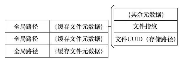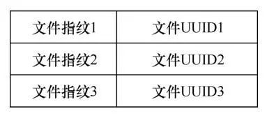 边缘缓存系统采用两层索引机制进行缓存文件的查找。整个边缘缓存系统的元数据持久化存储在分布式KV数据库系统中,索引机制具体细节如下。图5所示为边缘缓存系统的第一层映射机制:文件全局路径到缓存文件元数据的映射。缓存文件元数据除了包含缓存文件的生存时间值(time to live, TTL)、访问频度、文件大小等,还包含文件指纹和文件UUID(universally unique identifier)信息。其中文件指纹和UUID可由算法生成,用于唯一表示数据。文件指纹主要用来向广域虚拟数据空间文件系统发送申请,以校验文件是否过期,文件UUID表示文件在分布式文件系统中的存储路径。图5 第一层映射:文件全局路径到缓存文件元数据的映射图6所示为边缘缓存中的第二层映射,该映射表示文件指纹到文件UUID的映射。UUID可以被看作磁盘上的一个文件。第二层映射主要用于数据去重,边缘缓存系统中的文件都是通过广域网从虚拟数据空间系统中获取的,当需要获取远程文件时,如果文件指纹与已经缓存的文件匹配,则在底层文件系统中创建软链接即可。