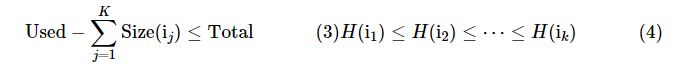 这时,根据边缘缓存系统的剩余空间是否足够,分为两种情况:① 剩余空间足够,即Used≤Total,此时不需要进行缓存替换,把新文件i存放在边缘缓存中;② 缓存空间不足,即Used>Total,此时必须进行对象替换,在缓存中选择k个具有非零最小代价H(i)的文件组i1,i2,…,ik,满足如式(3)、式(4)所示的2个条件: