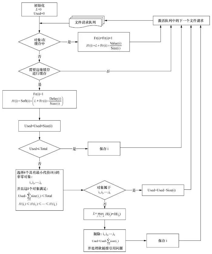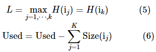 然后根据请求的文件i是否在替换文件中分成如下两种情况:● 如果请求的对象i不在这k个文件i1,i2,…,ik中,那么L的值就是这k个文件中价值H最大的那个值,然后按照式(5)、式(6)计算得到L和Used的值;
