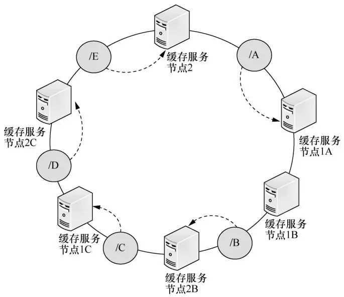 随着单一科研机构中客户端数量的增多,单个边缘缓存服务节点将成为边缘缓存系统的瓶颈。本文采用集群的方式来提高边缘缓存系统的服务能力。本文提出的边缘缓存系统的集群方案设计主要包括同构集群结构设计、基于一致性哈希算法的请求路由方法、基于可伸缩可传导的弱一致性进程组成员资格(SWIM)协议的集群成员维护方法。边缘缓存系统是广域虚拟数据空间系统的补充软件,为了降低系统的复杂性,本文将边缘缓存系统设计为同构集群,图8所示为边缘缓存系统的集群架构。如图8所示,边缘缓存系统由同构的边缘缓存服务节点构成,每个边缘缓存服务节点都具有缓存数据服务、缓存数据管理和集群状态维护等功能,最上层为部署在研究所内各类终端上的虚拟数据空间客户端,这些客户端在启动时可以选择是否使用边缘缓存系统。当不使用边缘缓存系统时,客户端可直接从广域虚拟数据空间系统进行数据访问,客户端后续不能感知到边缘缓存系统的存在;当选择使用边缘缓存系统时,客户端在访问文件时,首先查询想访问的文件是否在边缘缓存系统中,如果已缓存,则通过Proxy方式直接从边缘缓存系统获取文件;如果文件未在边缘缓存系统中缓存,则通过Bypass方式直接从广域虚拟数据空间系统访问数据。当集群中存在多个同构的边缘缓存服务节点时,边缘客户端访问任意一个节点即可获取边缘缓存服务。尽管各个边缘缓存服务节点提供的功能相同,但由于节点间性能不同,向外提供的服务能力也不同。因此,需要研究相关负载均衡(loadbalancing)方法把请求路由到合适的边缘缓存服务节点上。尽管一致性哈希算法可将边缘缓存服务节点加入和退出的影响降到最低,但在服务器数量较少时会导致映射不均匀,因此,本文提出了基于虚拟节点机制的一致性哈希策略的请求路由算法。具体地,引入虚拟节点的机制,即根据每个边缘缓存服务节点自身的性能进行多次哈希计算,再映射到圆环上。如图9所示,以1个边缘缓存服务节点(图9中简称为缓存服务节点2)为例,分别增加1A、1B、1C、2B和2C虚拟节点,并将这些虚拟节点映射到哈希环上。通过这种方式,节点的分布更加均匀,文件访问仍然根据先前的方法进行路由,并增加虚拟节点到物理节点的映射,文件访问请求被路由到相应的边缘缓存服务节点中,可解决请求路由在边缘缓存服务节点中分布不均匀的问题。