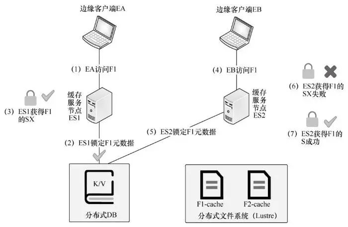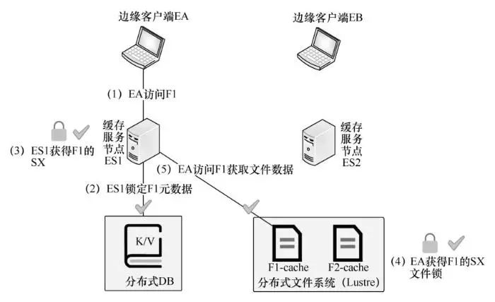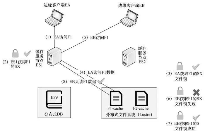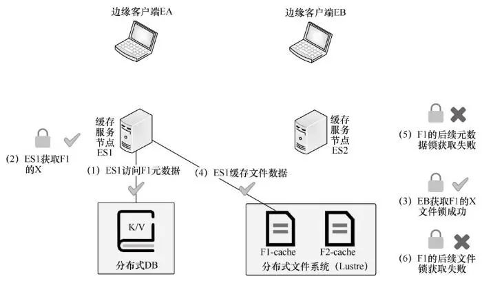 如图11所示,边缘客户端EA首先通过边缘缓存服务节点ES1获取F1元数据的共享排他锁,并继续后续访问。此时边缘客户端EB也通过边缘缓存服务节点ES2获取F1元数据的共享排他锁,因为锁的兼容性,此时只能获得共享锁。在ES1对F1元数据进行维护时,ES2只能对元数据进行查询操作。图12所示为文件加锁过程,边缘客户端EA访问缓存数据F1,首先通过边缘缓存服务节点ES1获取F1元数据的共享排他锁,需要获取文件的共享排他锁才可修改F1。边缘客户端EB也访问F1时,只能获取F1的共享锁,并进行只读操作。