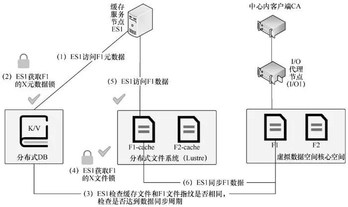 3.4.2 边缘缓存系统与广域虚拟数据空间系统之间的一致性机制边缘缓存系统采用类网络文件系统(network file system,NFS)的语义模型进行一致性控制,实现“打开-关闭”的一致性,并定期回写数据,以达到边缘缓存系统与广域虚拟数据空间系统的最终一致性;同时,边缘缓存系统会设置缓存文件的TTL和文件指纹。当文件被边缘客户端再次访问时,首先会检查文件指纹是否匹配,如果匹配,则通过边缘缓存系统访问文件数据,否则绕过边缘缓存系统直接访问广域虚拟数据空间系统。边缘缓存系统周期性地通过文件的TTL检查文件是否与广域虚拟数据空间系统一致,如果文件过期,则通过比较文件指纹来决定是否重新同步文件,并更新TTL。边缘缓存系统会检查文件是否过期,如果未过期,则认为缓存文件可用;如果文件过期且文件指纹与远程文件指纹不同,则重新同步文件。图14所示为同步过程,边缘缓存服务节点ES1首先获取F1的元数据排他锁,检查缓存的文件和F1文件指纹是否相同或检查数据是否达到同步周期。如果达到同步周期,ES1获取F1的文件排他锁进行数据同步;同时,当边缘客户端完成对缓存文件数据的读写时,将缓存的文件同步到广域虚拟数据空间系统中,并可设置写回间隔,以满足类NFS语义。图14 边缘缓存系统与广域虚拟数据空间系统的同步过程3.5 边缘缓存系统与广域虚拟数据空间系统接口设计