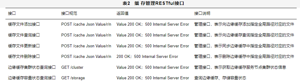 为了实现边缘缓存系统与广域虚拟数据空间系统之间的交互,需要设计合理的交互接口。本节将介绍边缘缓存系统中的缓存管理接口和数据访问接口,从而实现边缘缓存系统与广域虚拟数据空间系统的对接。表2和表3描述了缓存管理RESTful接口和数据访问接口。