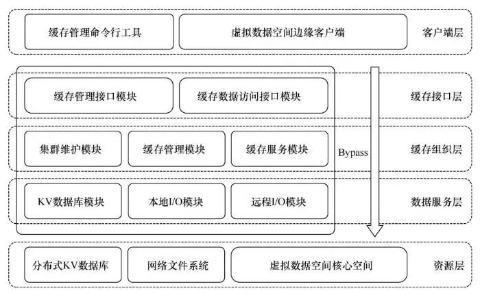 图15所示为边缘缓存系统在广域虚拟数据空间系统中的具体实现。边缘客户端和边缘缓存服务节点共同组成了边缘缓存系统。边缘缓存服务节点提供边缘缓存系统的核心功能,包括缓存管理、缓存服务和缓存集群维护等功能。边缘客户端包括虚拟数据空间客户端模块,使得虚拟数据空间客户端能够感知边缘缓存系统的存在。图16所示为边缘缓存系统的组成。边缘缓存系统包含5层,其中,最上层为客户端层,客户端层主要包括缓存管理命令行工具、虚拟数据空间边缘客户端;中间3层组成了边缘缓存服务节点,其包含缓存接口层、缓存组织层和数据服务层,缓存接口层包括缓存管理接口模块、缓存数据访问接口模块,缓存组织层包含集群维护模块、缓存管理模块、缓存服务模块,数据服务层包含KV数据库模块、本地I/O模块及远程I/O模块;最下面一层为资源层,包含分布式KV数据库、网络文件系统和虚拟数据空间核心空间,边缘客户端可以绕过中间3层,直接与处于资源层的广域虚拟数据空间系统进行通信,并获取数据。图17所示为边缘缓存系统中各模块间的具体交互。
