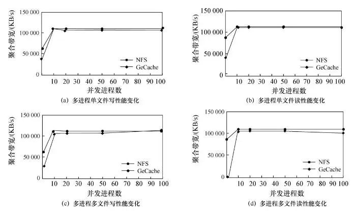 图22所示为GVDS与GeCache在多进程并发情况下的文件读写性能测试结果。如图22所示,GeCache的性能在4种情况下都远高于GVDS。例如,在多进程多文件写场景中,随着并发进程的数量从0增加到100, GeCache的聚合带宽可以达到110 000 KB/s,而GVDS只有将近100 KB/s。这是因为在多进程并发访问的情况下,GVDS和GeCache的聚合带宽大大提升;在并发进程数超过10之后,聚合带宽变化趋于稳定,这是因为GeCache达到了局域网千兆带宽的瓶颈,GVDS系统达到了广域网带宽的瓶颈。