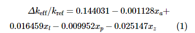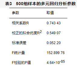 使用ANT-MOC完成500组计算后,计算每个有效增殖因子keff与参考值kref的相对误差。由于输入参数的取值范围不大,在这一范围内使用线性模型近似地研究各参数与相对误差的关系。给定显著性水平0.05,可以为这500组数据建立四元线性回归模型:可以使用该模型估计keff的相对误差随轨迹分布的变化情况。回归分析的各参数见 表3。