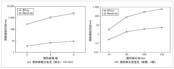 图5(a)展示了燃料棒数目变化时, PACA与HARSA耦合时两种插值方式的耗时,其中纵轴为消耗时间的对数表示。当燃料棒数目增大时,RTree的耗时远小于BaseLine的耗时 。图5(b)展示了燃料棒长度变化时两种插值方式的耗时。当燃料棒长度增大时,RTree的耗时仍远小于BaseLine的耗时。可见,RTree在高精细插值模拟中更具优势。5 基于数值核反应堆大数据的科学发现