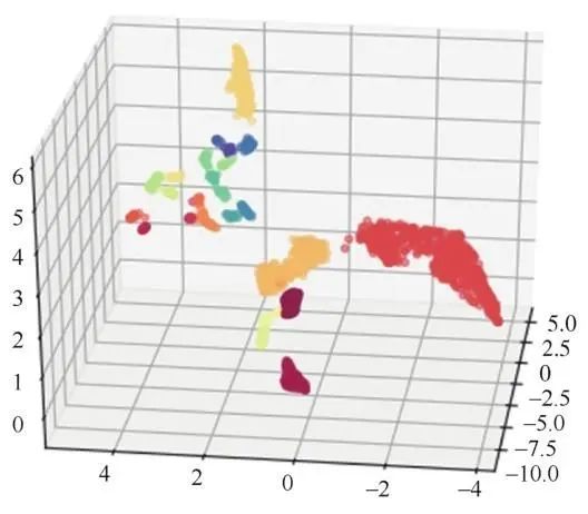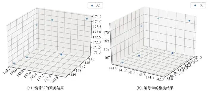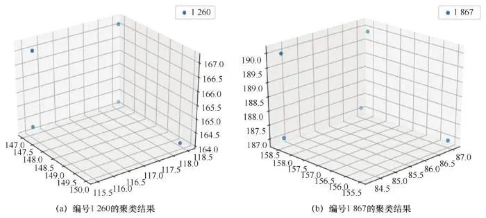 KMC团簇大数据库包含了不同实验条件下经KMC长程演化后的原子团簇信息。KMC团簇大数据库包含PKA能量、PKA入射方向等实验参数以及团簇中各个原子坐标、空位、间隙原子数目等信息。这里共选取500条团簇数据展开分析。因为团簇形态和数目信息是未知的,所以有监督的学习方法在此不适用。无监督的机器学习方法在解决这一问题上具有独特优势,这里采用基于密度的聚类算法。首先,选取的特征向量为缺陷团簇中各缺陷与几何中心的距离、每两个缺陷与几何中心形成的夹角。考虑到几何形状经旋转、放大、缩小后仍然是相同的,对于角度,这里每隔5°形成一维数据,共有36维数据;对于距离,每次将所有的距离除以当前团簇的最大值,进行归一化处理,每隔0.025形成一维数据,共40维数据,因此特征向量为76维数据,如图7所示。选取HDBSCAN聚类算法对团簇进行识别,轮廓系数达到0.643。HDBSCAN聚类算法是一种基于密度的无监督的聚类算法,不需要标记过的数据,也不需要事先知道要划分的类别数。它可以对不同密度的团簇进行聚类,可以忽略噪声,且效率较高。团簇聚类结果 如图8所示。这里使用卡方距离作为相似性度量,使用轮廓系数(silhouette coefficient)作为聚类性能的内部评价指标,若轮廓系数接近1,则说明样本聚类合理;若轮廓系数接近-1,则说明样本更应该分类到另外的簇;若轮廓系数近似为0,则说明样本i在两个簇的边界上。图8中的所有缺陷团簇被分为几种不同的类别,每种颜色代表一种类别。本实验共获得了22种形状类别,从这22种类别中随机选取两种类别,每种类别选择两个团簇,将其进行可视化展 示。图9为类别1中的两个团簇,1 260和1 867是它们在数据库中的编号,它们具有完全相同的形状,都是四个角构成一个方形,然后有一个 顶点。图10则是另一个类别中的两个团簇,它们和类别1不同,它们的缺陷个数有6个,而且它们分为上下两排,每排3个缺陷,这两排构成近似平行的几何形状。