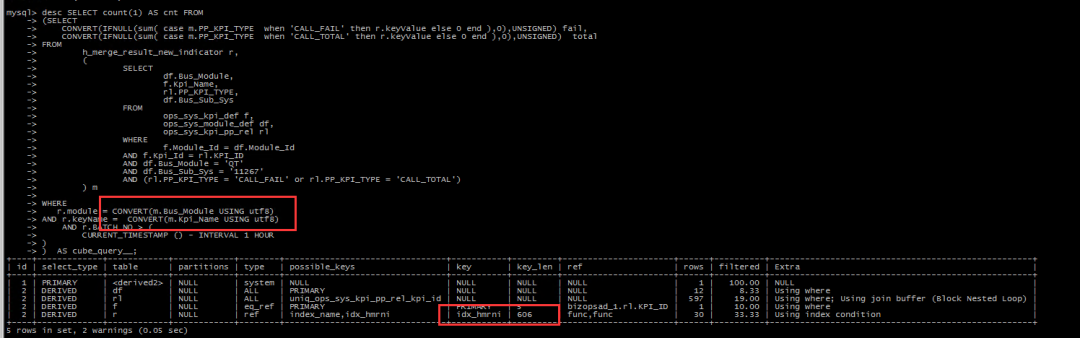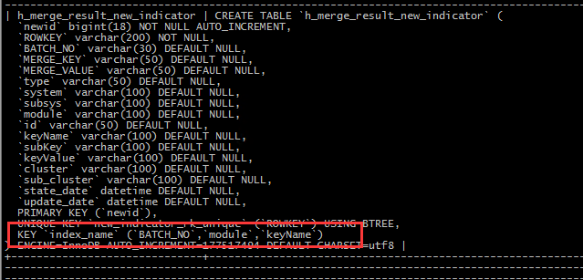 从执行计划分析看出问题出在r表也就是h_merge_result_new_indicator表全表扫描,查看该表的表结有联合索引。但是联合索引范围后会失效,于是打算新建一个联合索引,