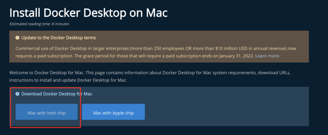 相关地址:Install Docker Desktop on Mac | Docker Documentation (https://docs.docker.com/desktop/mac/install/)