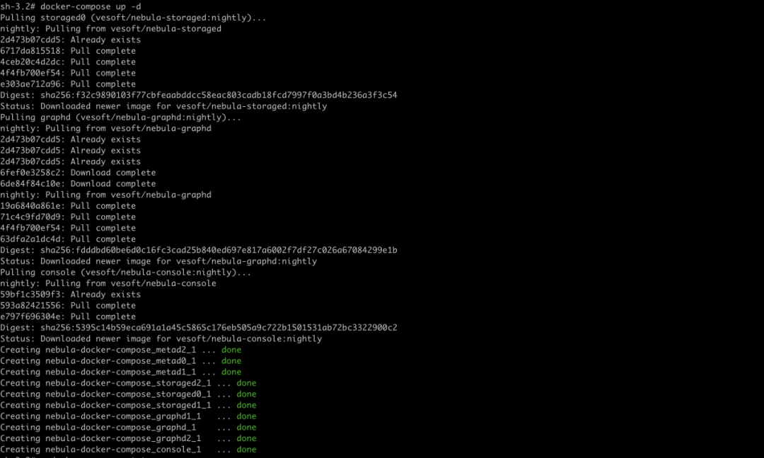 docker run --rm -ti --network nebula-net --entrypoint=/bin/sh vesoft/nebula-console:v2-nightly nebula-console -u root -p nebula --port 9669 --address graphd