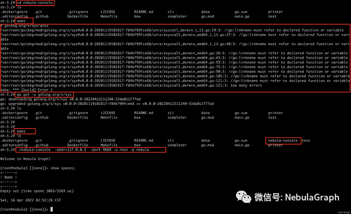 git clone https://github.com/vesoft-inc/nebula-consolecd nebula-consolemakego get -u golang.org/x/sysmake./nebula-console -addr=127.0.0.1 -port 9669 -u root -p nebula