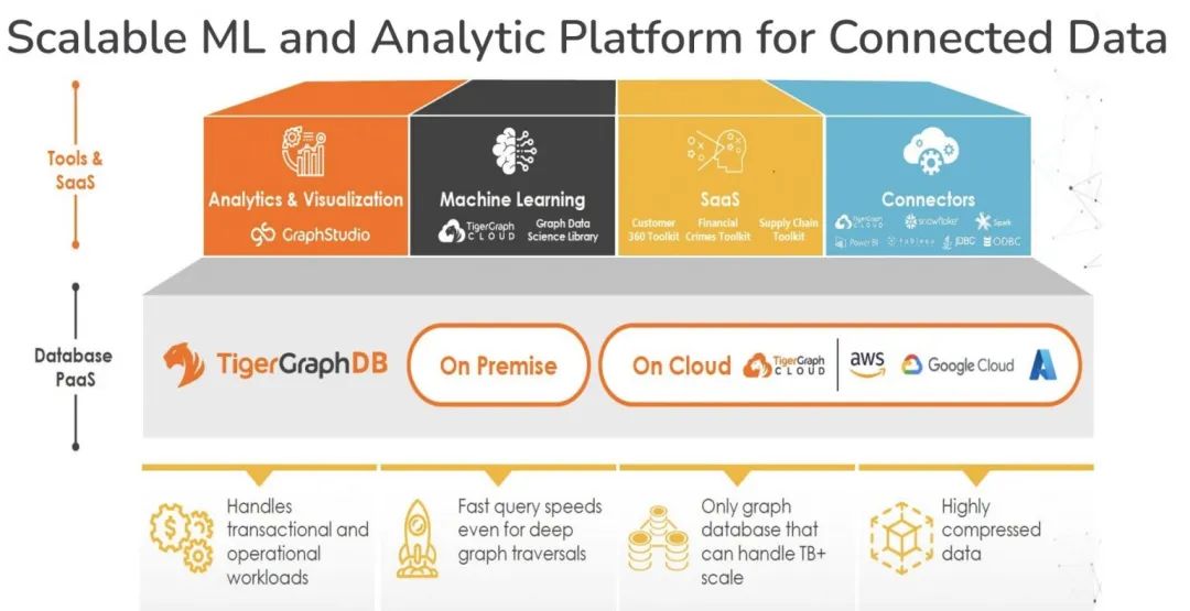第三块是saas模式的应用。因为图数据库其实是很新的一块技术,很多公司不明白为什么要用图数据库,因为他们对关系型数据库或NOSQL已经很了解,像mogodb、snowflake、oracle等。图对他们来说是非常新的东西。所以我们不只是提供图数据库,我们也i打造了很多现成的产品,比如怎么反欺诈,因为我们做了很多反欺诈的案例,我们把相关的schema、query全部抽出来,然后在前端建一个用户界面,你可以直截了当的看到一个现成的产品,其底层是一个图数据库。因此业务端用户不需要了解底层的图数据库,就可以直接使用上层的产品。这也是为什么很多大型银行选择TigerGraph,原因之一就是他们看到我们的技术能够给他们带来什么,而不需要专门建一个团队,搞清楚图数据库是怎么回事,然后再在上面建不同的应用。而且这些应用都是saas模式,所以很容易在cloud上去跑。