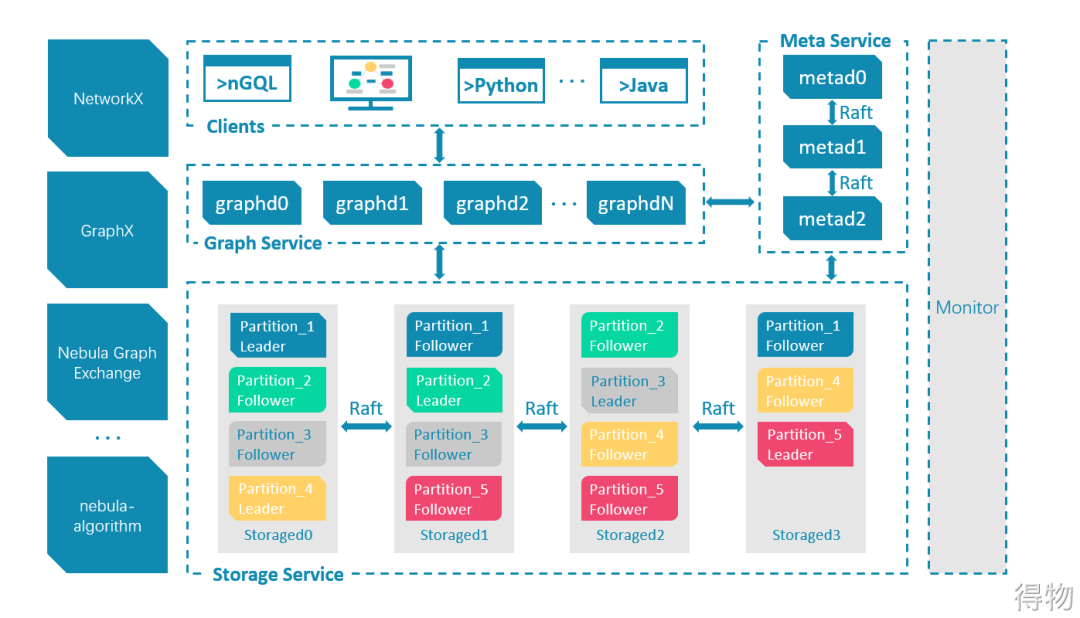 今天我们介绍的是目前得物在使用的一款开源图数据库产品Nebula Graph。Nebula Graph 由三种服务构成:Graph 服务、Meta 服务和 Storage 服务,是一种存储与计算分离的架构。Graph 服务负责处理计算请求,Storage 服务负责存储数据,Meta 服务负责数据管理。