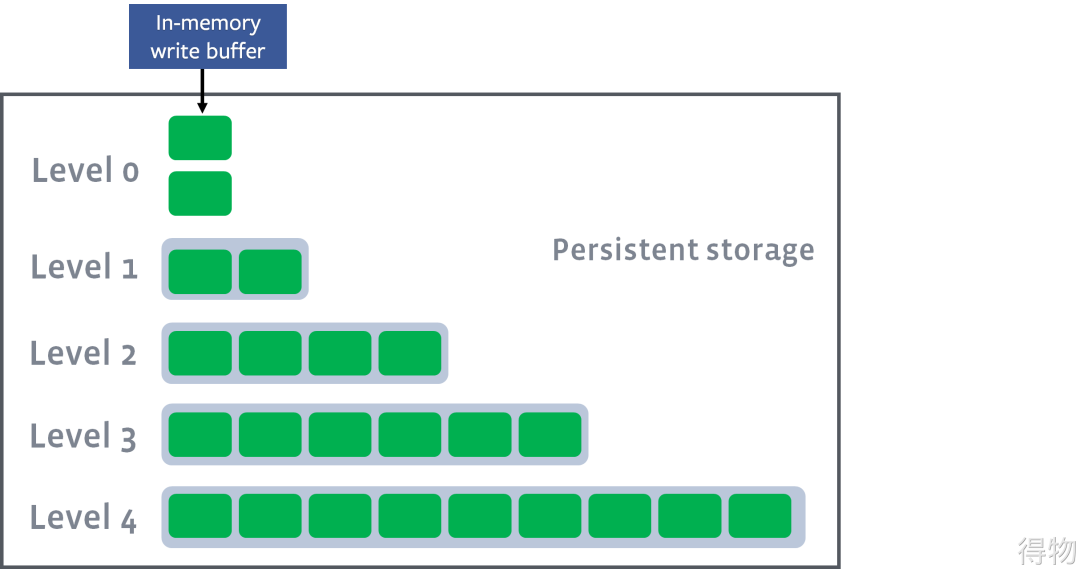 LSM磁盘上的文件被分成多层进行组织,我们叫他们Level-1, Level-2,等等,或者简单的L1,L2,等等。一个特殊的层,Level-0(L0),会包含刚从内存memtable落盘的数据。每个层(除了Level0)都是一个独立的排序结果,为了加快LSM查询速度引入 Block_Cache缓存和 Indexes and bloom filters缓存。