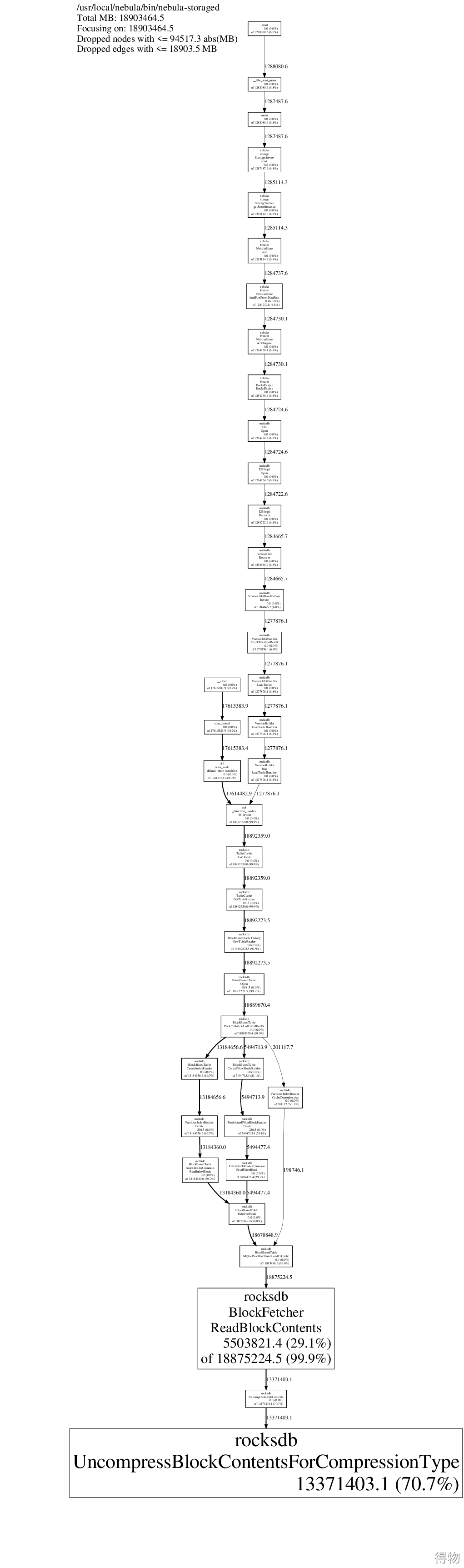 生成 jeprof.*heap 文件进行内存占用量分析参考命令如下:MALLOC_CONF="prof:true,lg_prof_interval:26" LD_PRELOAD="/usr/lib64/libjemalloc.so.2" usr/local/nebula/bin/nebula-storaged --flagfile usr/local/nebula/etc/nebula-storaged.conf通过 jeprof 读取生成的 jeprof.*heap 文件jeprof usr/local/nebula/bin/nebula-storaged jeprof.5327.*(jeprof) topTotal: 18903464.5 MB13371403.1 70.7% 70.7% 13371403.1 70.7% rocksdb::UncompressBlockContentsForCompressionType5503821.4 29.1% 99.9% 18875224.5 99.9% rocksdb::BlockFetcher::ReadBlockContents5923.5 0.0% 99.9% 6518.4 0.0% rocksdb::LRUCacheShard::Insert4704.0 0.0% 99.9% 4704.0 0.0% std::__cxx11::basic_string::_M_mutate3257.7 0.0% 99.9% 10664.1 0.1% rocksdb::BlockBasedTable::PutDataBlockToCache2964.1 0.0% 99.9% 3261.7 0.0% std::__detail::_Map_base::operator[]2085.1 0.0% 100.0% 2085.1 0.0% rocksdb::VersionBuilder::Rep::ApplyFileAddition1714.6 0.0% 100.0% 1714.6 0.0% std::_Rb_tree::_M_insert_unique1483.0 0.0% 100.0% 1783.5 0.0% nebula::meta::MetaClient::loadSessions888.5 0.0% 100.0% 18892273.5 99.9% rocksdb::BlockBasedTable::Open