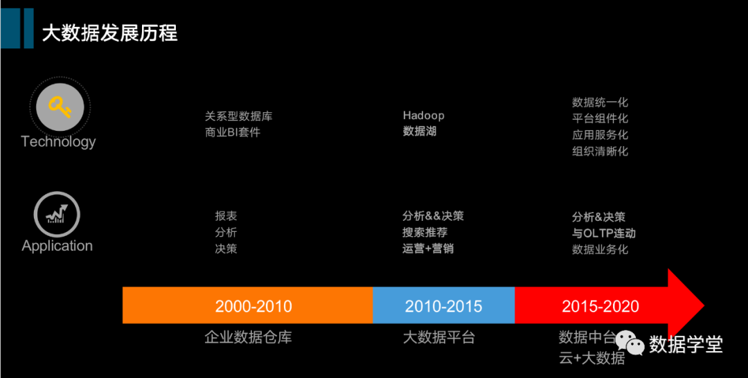 2010-2015年,大数据平台阶段,移动互联网的飞速发展带动Bigdata(大数据)的发展。其中Hadoop生态技术开始逐步在国内大范围使用,企业只要基于Hadoop分布式的计算框架,使用相对廉价的PC服务器就能搭建起大数据集群。