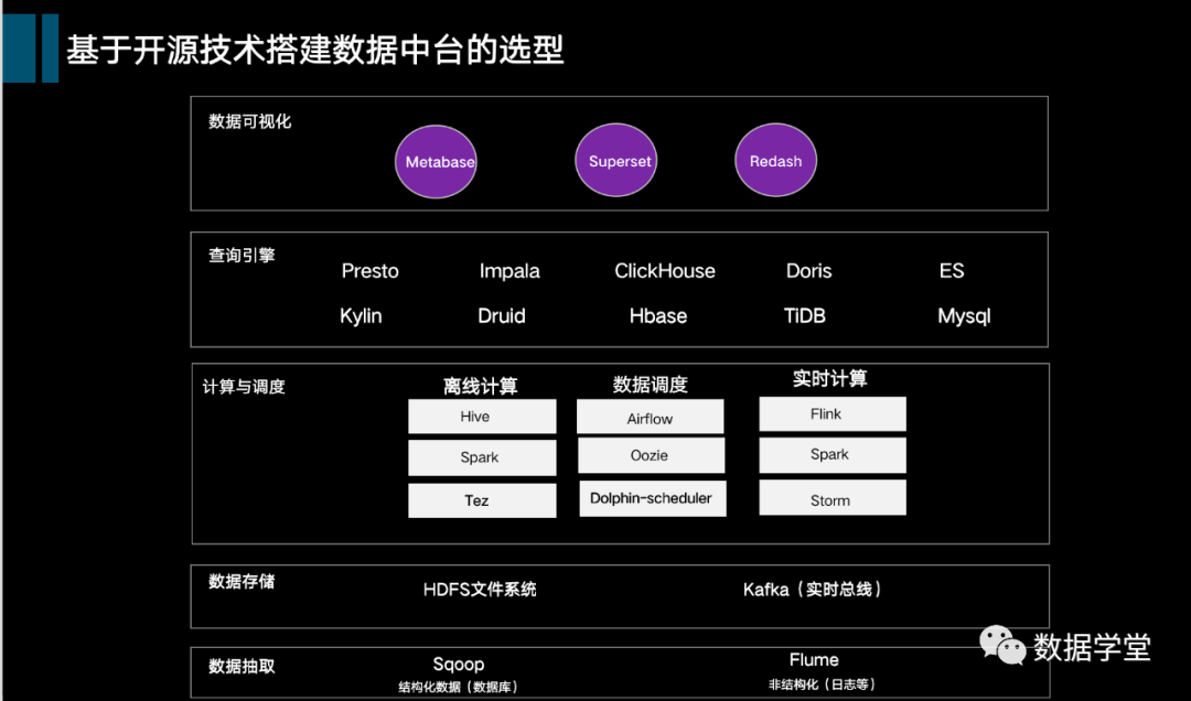在搭建数据中台方面,基于开源技术的选型,尤其是Hadoop生态圈有非常多的选择,从数据整体流向来看各大层级的选型。