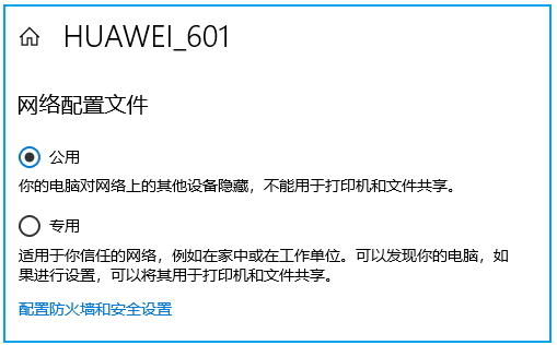 两种网络,对应了两种配置,即专用配置和公用配置。除了这两种配置文件,还有一种在个人电脑中很少用到的 domainprofile,即域配置。