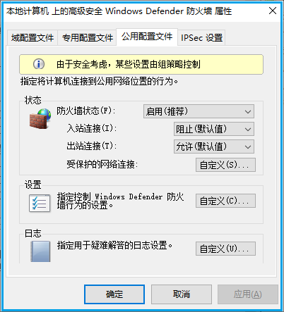 如果当前网络类型为"公用" , 此时就是公用配置起作用,而专用配置不生效。