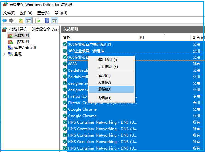 后面就到了详细写明细规则的时候了,我建议把入出站规则中的规则全部清空,即全都删掉。