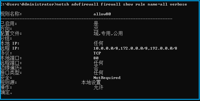 查看所有规则netsh advfirewall firewall \show rule name=all verbose查看所有入站规则netsh advfirewall firewall \show rule name=all dir=in verbose查看所有出站规则netsh advfirewall firewall \show rule name=all dir=out verbose
