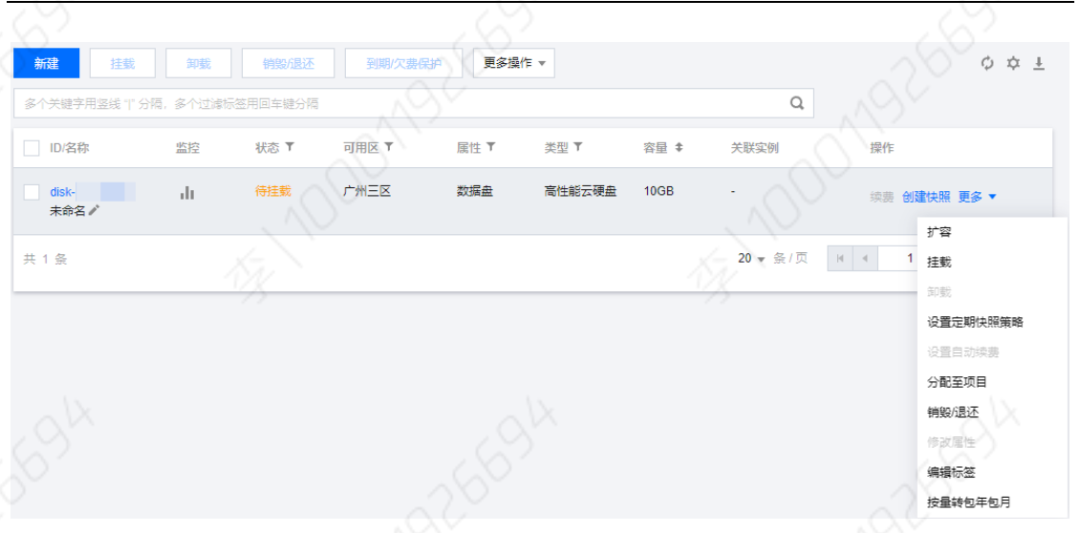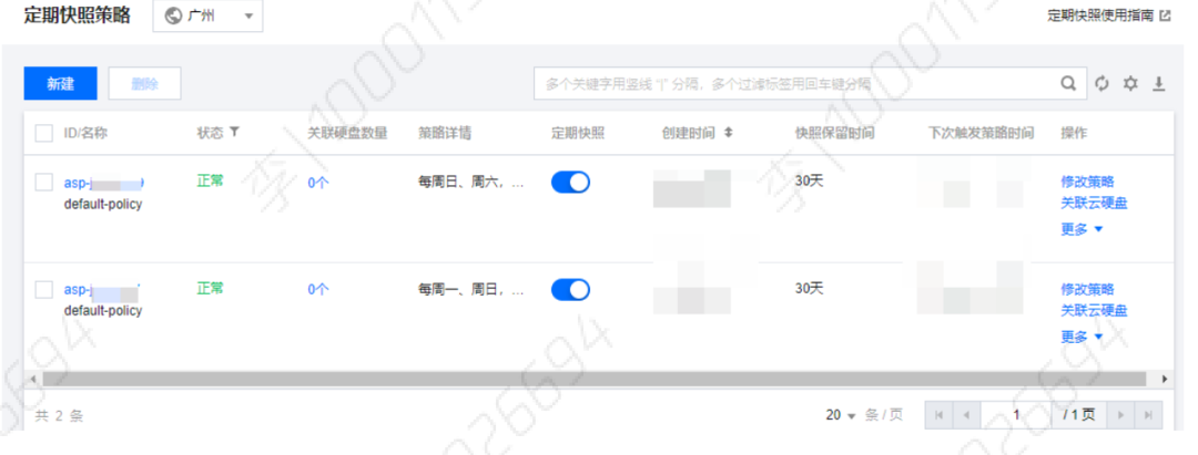 请访问云硬盘页面,找到要启用定期快照的云硬盘,然后点击页面右侧的