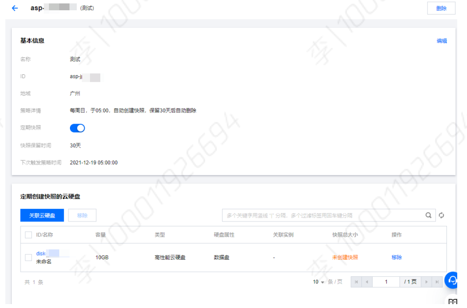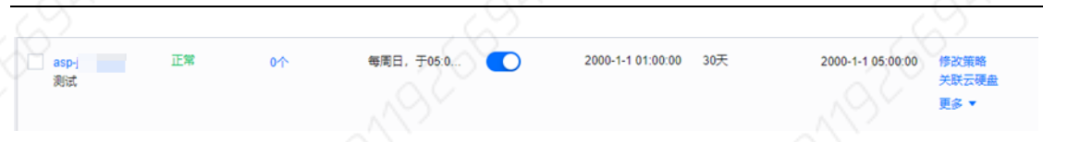此外查看已关联定期快照策略的云硬盘,可以在定期快照策略页面,找到您创建的策略,点击该策略的