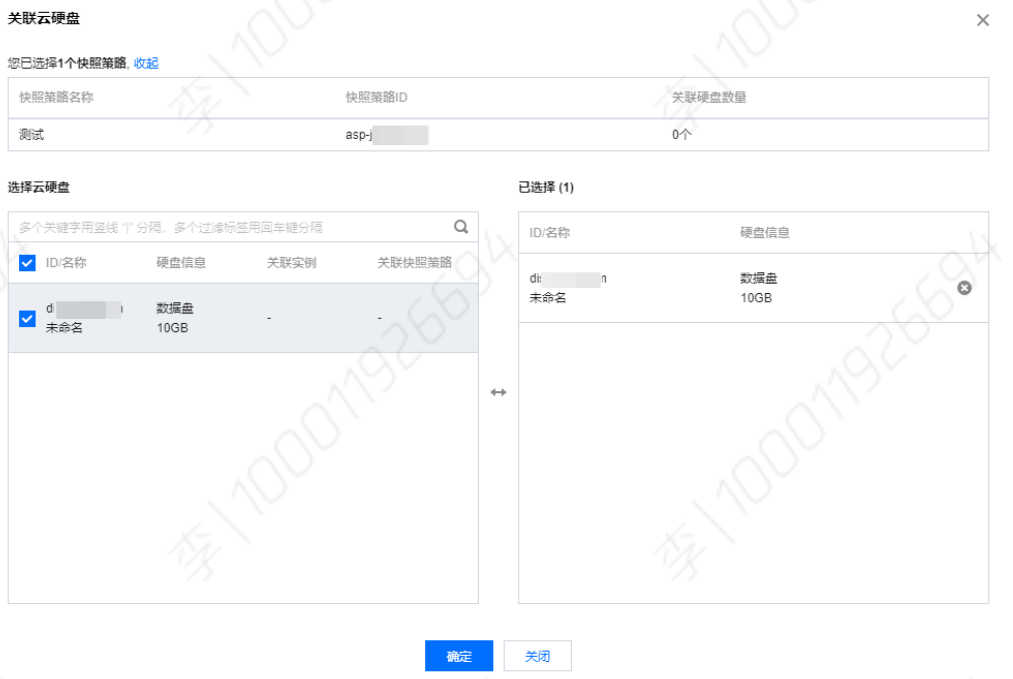 对话框中,勾选要启用定期快照的云硬盘,然后点击