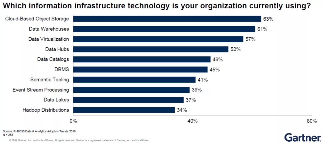 Gartner于2018年针对数据和分析的采用趋势进行了一项调查(多选题)。结果显示企业机构目前使用最普遍的信息基础架构技术为“基于云平台的数据存储”(63%)。