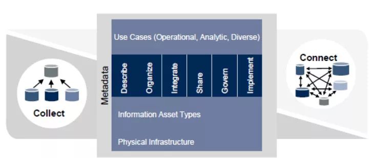 原因在于,从数据被“采集”到应用其价值,这中间有相当长的流程(如上左图所示),包括描述、整理、集成、分享、治理和实施。这一长串流程对企业机构内部IT技术具有相当大的考验。