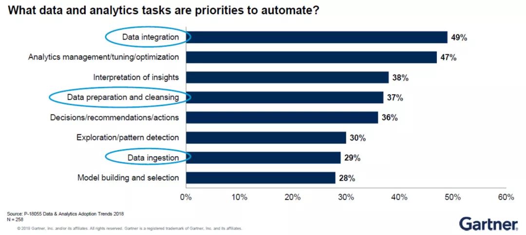 Gartner就数据分析工作的自动化优先级进行过一项调研。调研结果显示,数据集成(Data Integration)排名第一,因为其最费时间也最易出错。