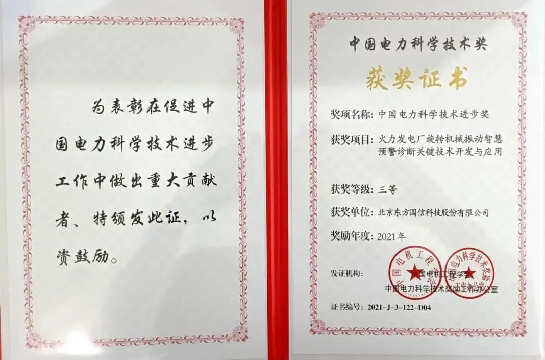 日前,北京东方国信科技股份有限公司收获又一荣誉,公司凭借《火力发电厂旋转机械振动智慧预警诊断关键技术开发与应用》在中国电机工程学会公布的“2021年度中国电力科学技术奖”中荣获“中国电力科学技术进步奖”三等奖。
