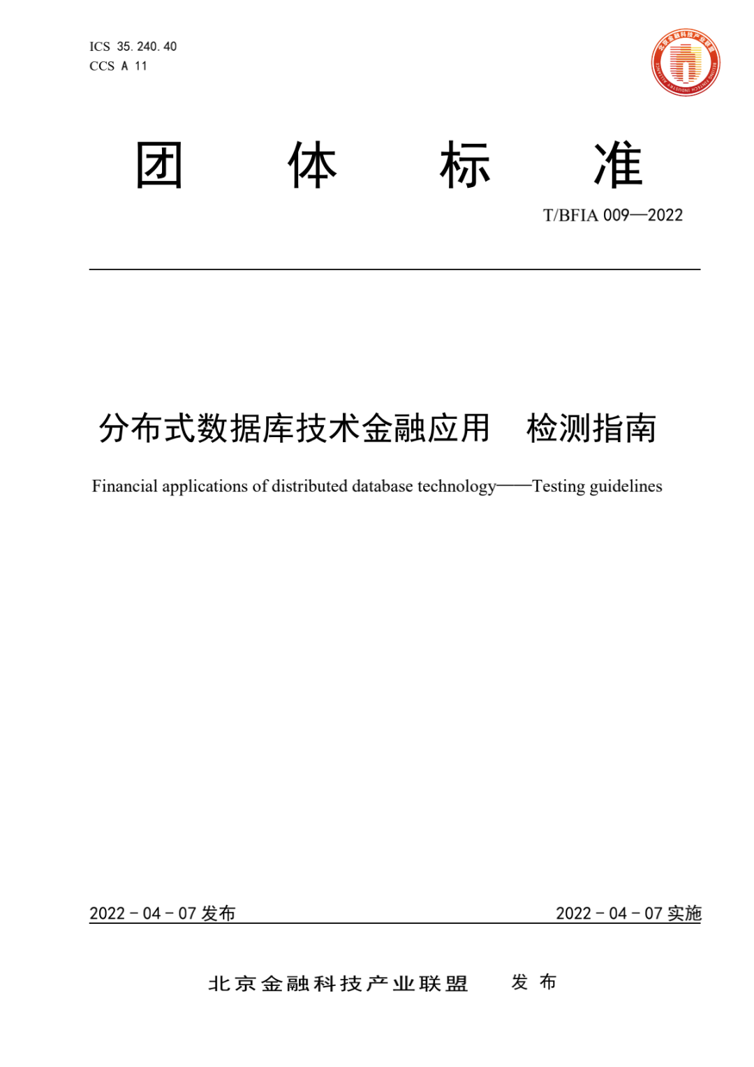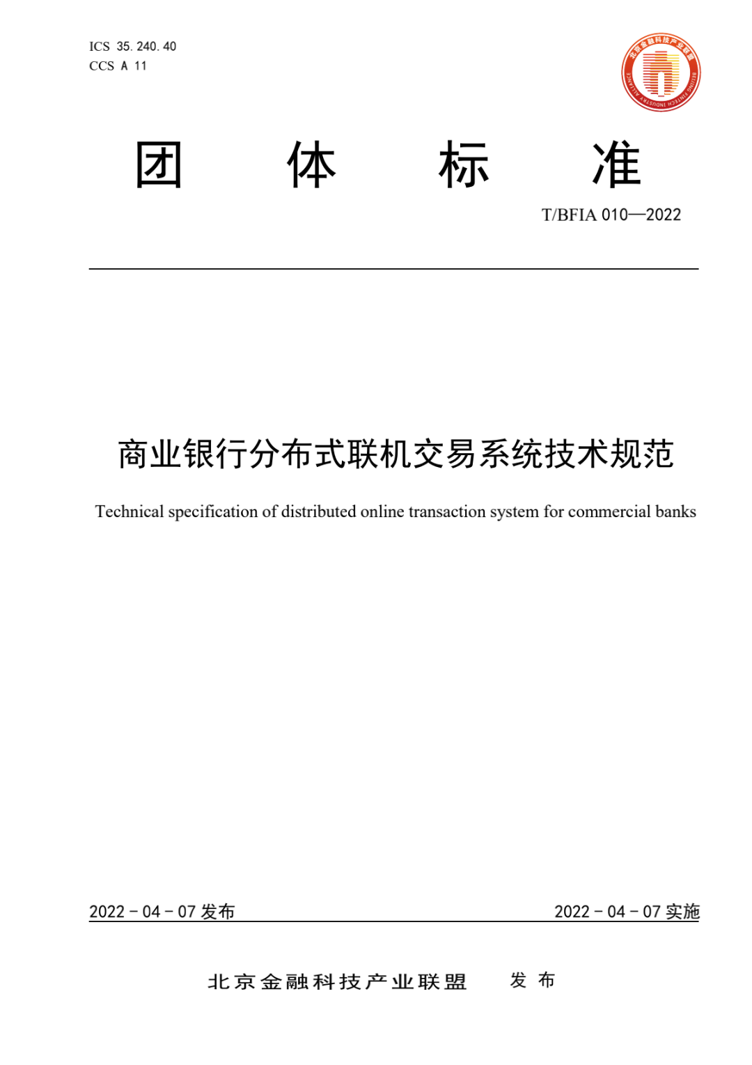 2022 年 4 月 7 日,北京金融科技产业联盟批注并正式发布了《分布式数据库技术金融应用检测指南》(T/BFIA 009—2022)、《商业银行分布式联机交易系统技术规范》(T/BFIA 010—2022)、《移动金融客户端应用软件无障碍服务评估规范》(T/BFIA 011—2022)和《银行营业网点适老服务要求》(T/BFIA 012—2022)四项金融团标标准。
