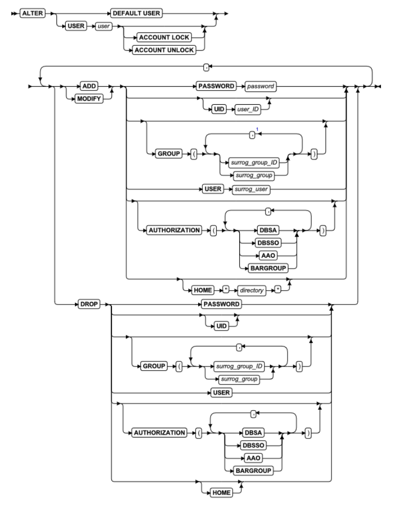 ALTER USER bill MODIFY UID 1361, ADD GROUP (dbsa), ADD HOME "/u/user1";