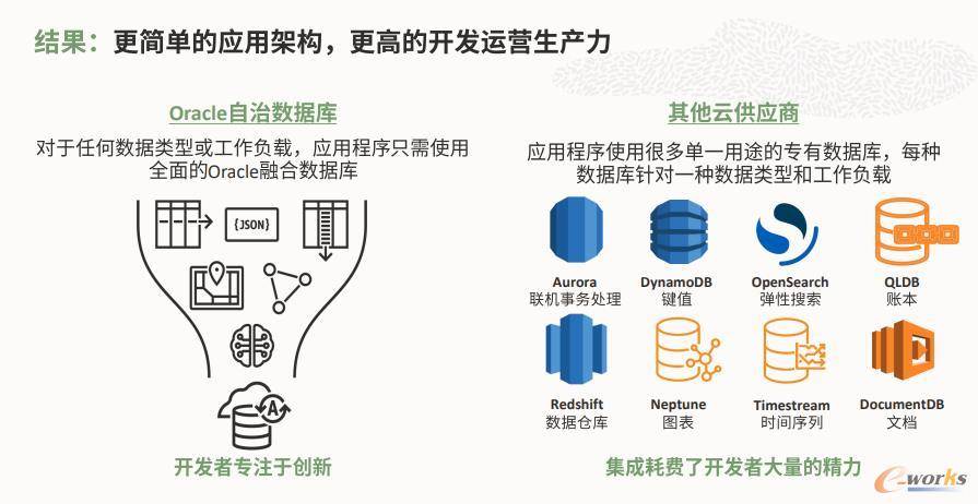 吴承杨指出,Oracle自治数据库的最大优势是让开发者专注于创新,而不用为各种集成耗费大量时间和精力。相比于其他云供应商使用很多单一用途的专用数据库,每种数据库针对一种数据类型和工作负载,Oracle自治数据库以更简单的应用架构,可以实现更高的开发运营生产力。