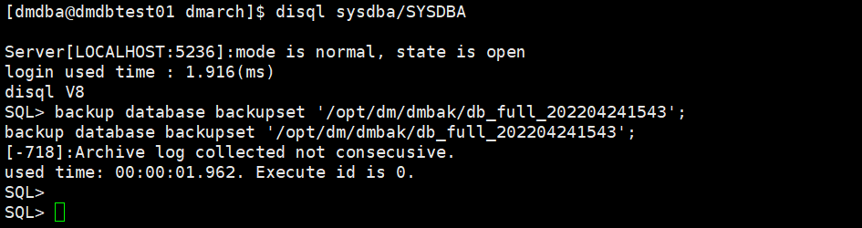 在搭建DM8主备数据守护集群时,对主库进行备份时报错[-718]:Archive log collected not consecusive,如下,