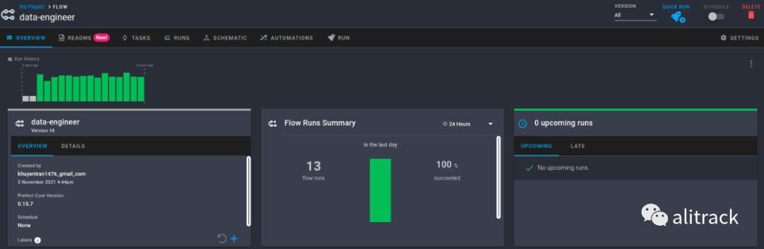 单击输出中的 URL,您将被重定向到概览页面。概述页面显示流程的版本、创建时间、流程的运行历史记录及其运行摘要。