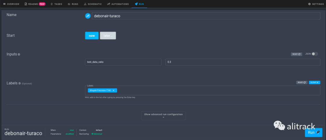 要使用自定义参数运行工作流,请单击运行选项卡,然后更改输入下的参数。