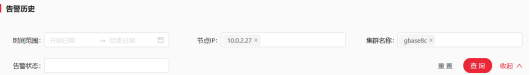 告警历史子功能便于用户查看集群运行过程中出现的告警信息。根据标签(时间范围、节点IP、集群名称、告警状态)分类查看告警信息。如误选标签,可以点击对应标签的按钮,或点击重置按钮,恢复初始筛选条件。