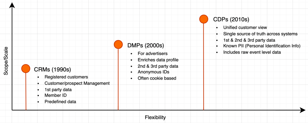 CDP (Customer Data Platform) 是近些年时兴的一个概念。随着时代发展、大环境变化,企业在自有媒体增多的同时,客户管理、营销变难,数据孤岛问题也愈发严重,为了更好的营销客户,CDP 诞生了。纵向来看,CDP 出现之前主要经历了两个阶段:- CRM 时代,企业通过电话、短信、email 与现有客户和潜在客户的互动,以及执行数据分析,从而帮助推动保留和销售;